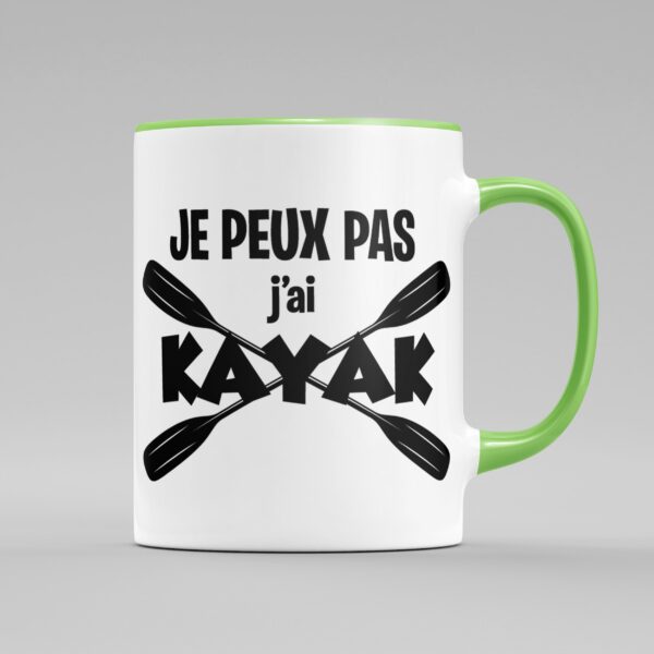 TASSE “JE PEUX PAS J’AI KAYAK” 2 Matériaux: Tasse en céramique. Contenance: Peut contenir jusqu’à 330 ml. Entretien: Lavable au lave-vaisselle et micro-onde.