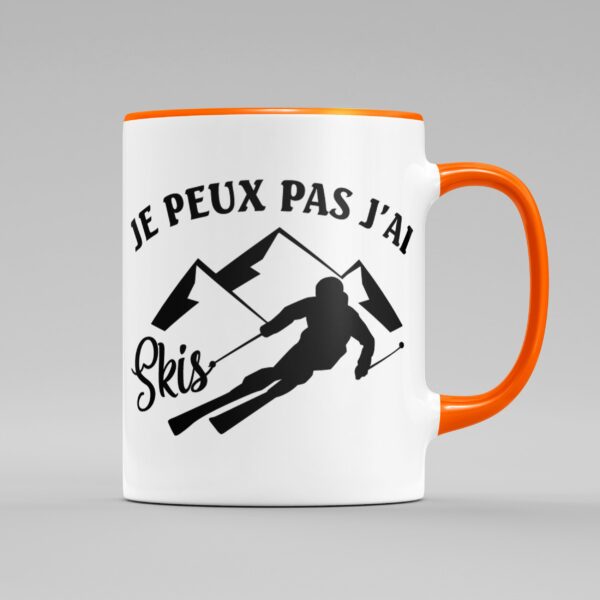 TASSE “JE PEUX PAS J’AI SKI” Matériaux: Tasse en céramique. Contenance: Peut contenir jusqu’à 330 ml. Entretien: Lavable au lave-vaisselle et micro-onde.